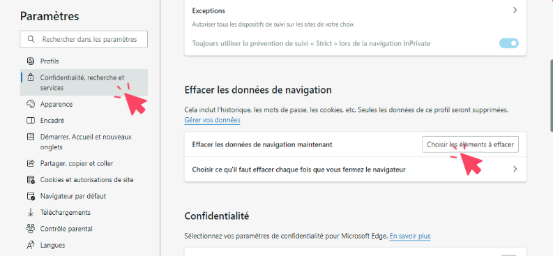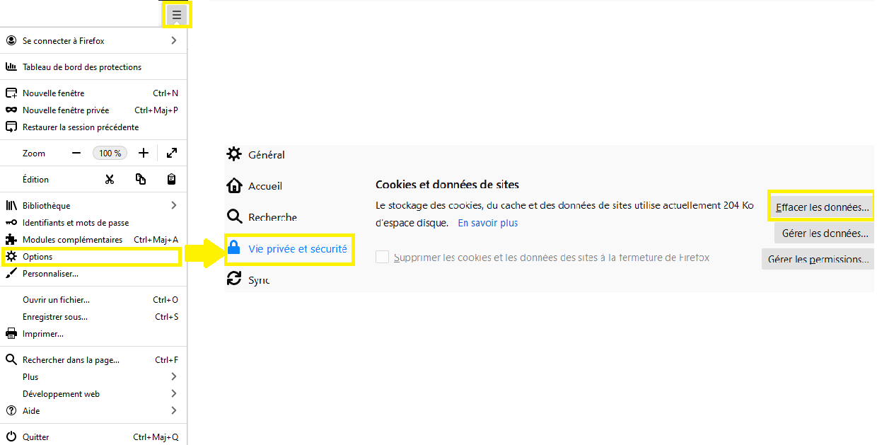 Aller sur le menu hamburger en haut à droite du navigateur, choisir le menu « options » puis « vie privée et sécurité » puis « effacer » :