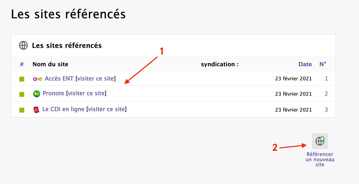 Vous voyez alors la liste des sites référencés (1). Cliquez sur celui un site dans la liste pour le modifier (ou le supprimer) ou cliquez sur « Référencer un nouveau site » en bas à droite pour créer un nouveau référencement de site (2).