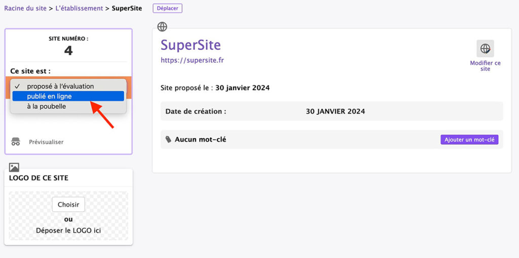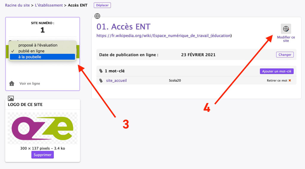 Pour le supprimer, sur la gauche, à la place de « Ce site est publié en ligne, choisissez « à la poubelle » (3) et validez.