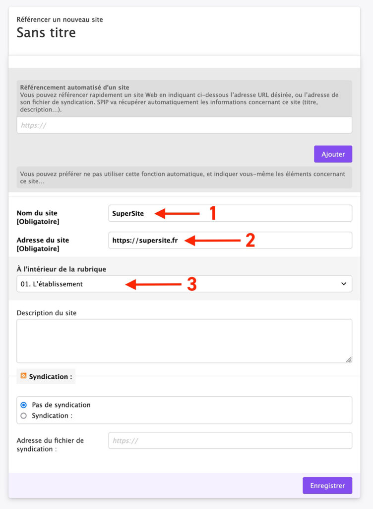 Nom, adresse et rubrique sont les seuls champs qui nécessitent d’être remplis pour référencer un site.