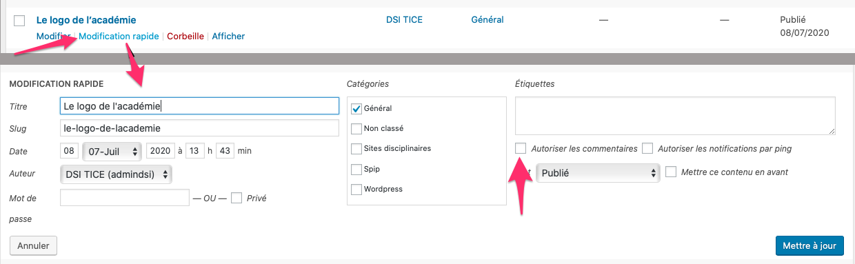 Lorsque vous affichez la liste des articles, vous pouvez désactiver les activer/commentaire pour un article dans la liste avec l’option Modification rapide et en cochant/décochant alors l’option Autoriser les commentaires.