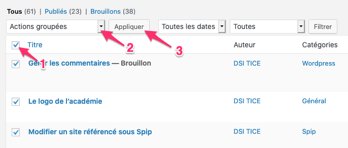 Vous pouvez appliquer ce réglage à tous ou plusieurs articles de la liste par une action groupée. Sélectionnez tous les article (1). Dans la liste Actions groupées, choisissez Modifier (2) et cliquez Appliquer (3)
