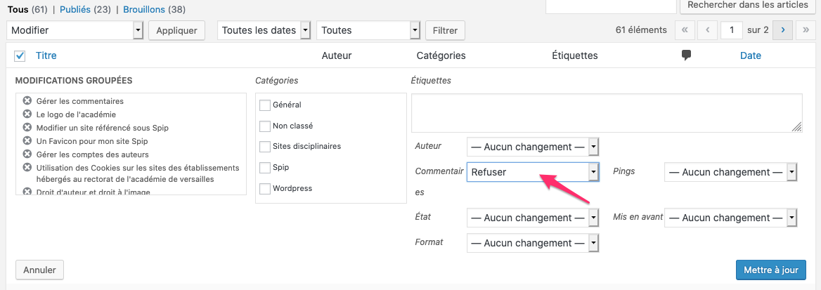 L’affichage suivant apparaît. Il suffit alors de choisir l’option Autoriser ou Refuser du champs Commentaires et de mettre à jour.